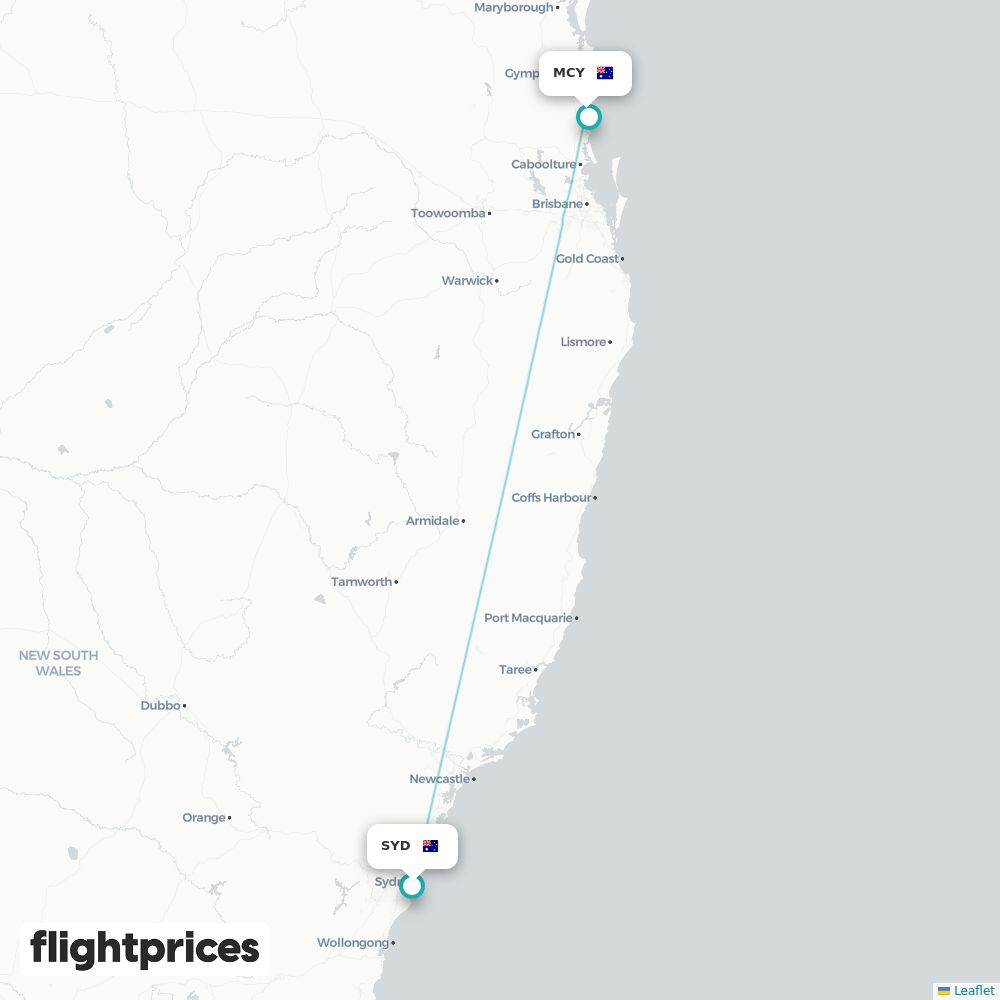 A quick snapshot of Sydney (SYD) to Sunshine Coast (MCY) fares — lowest and typical prices plus the cheapest months and weekdays to fly, the airlines on the route and the usual duration.