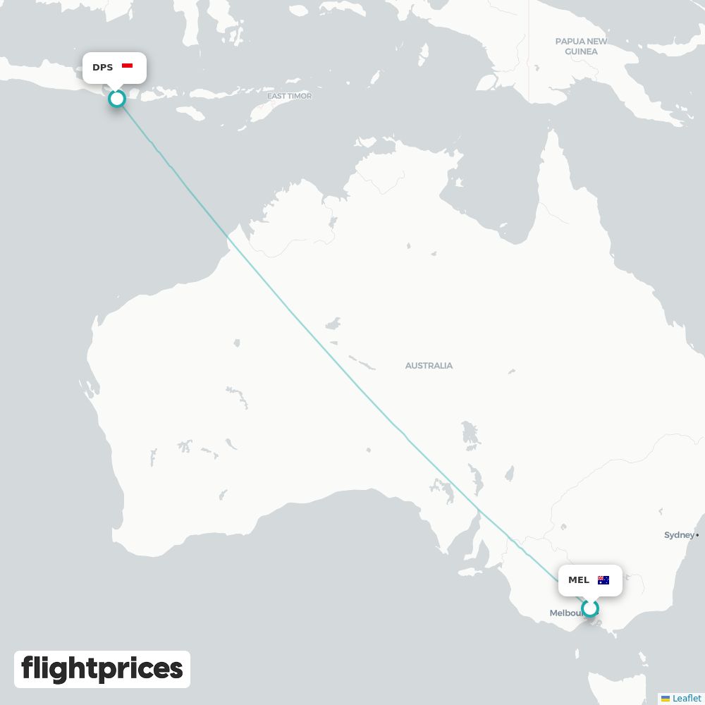 A quick snapshot of Melbourne (MEL) to Denpasar (DPS) fares — lowest and typical prices plus the cheapest months and weekdays to fly, the airlines on the route and the usual duration for travel from Australia to Indonesia.